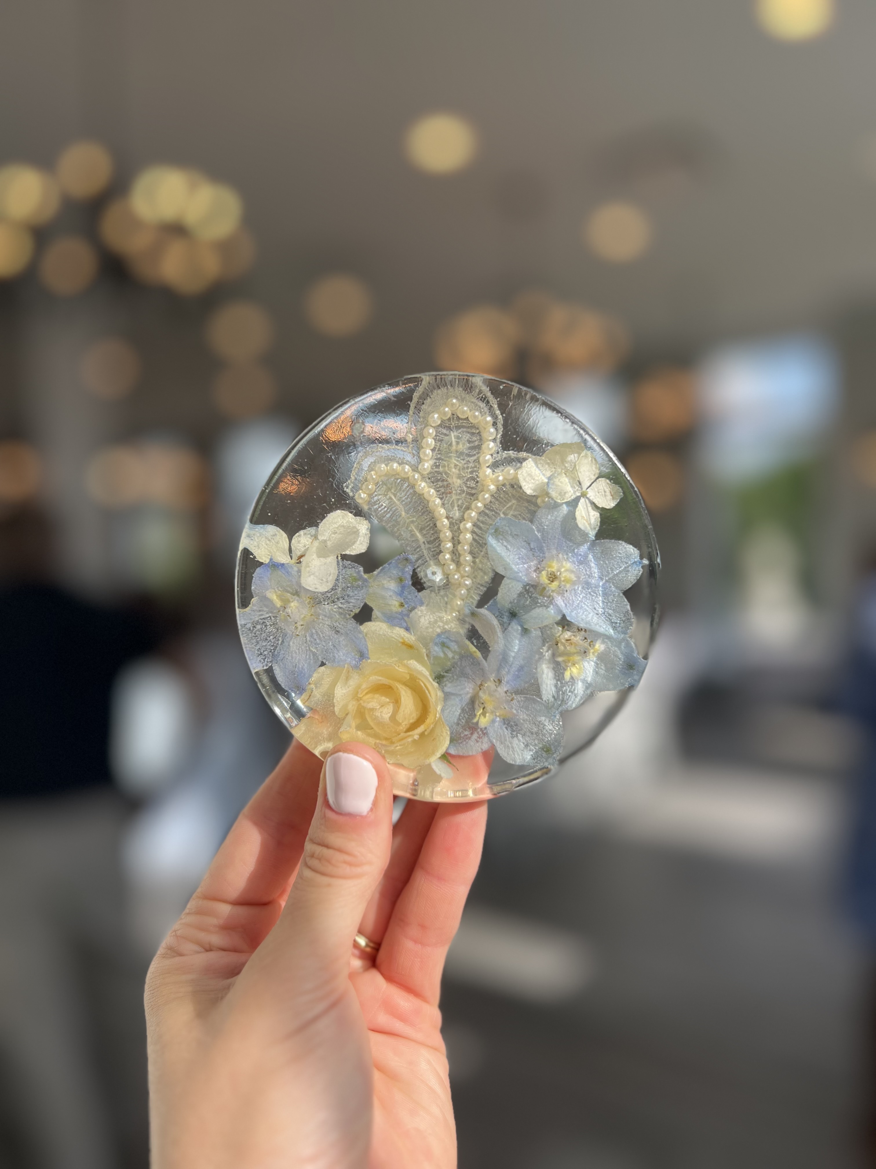 Encasing your perfectly dried florals into resin epoxy to showcase the special blooms from your bouquet or even a piece of lace from your dress. Inquire about the possibility of our Epoxy coasters, ornaments, or trays!